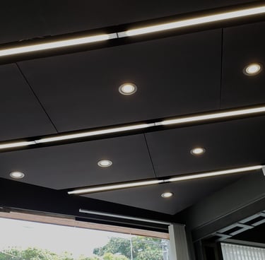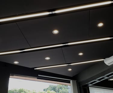 Paneles acústicos con iluminación lineal integrada. Una solución elegante que aporta confort visual y acústico de forma unificada.