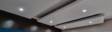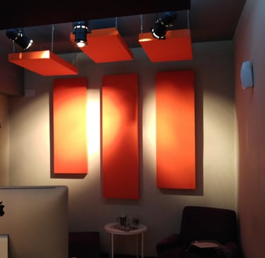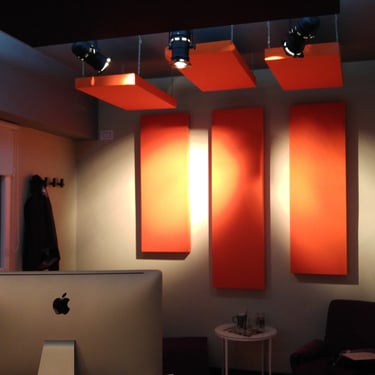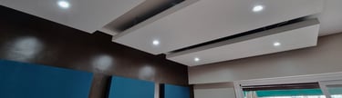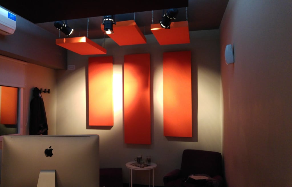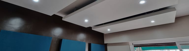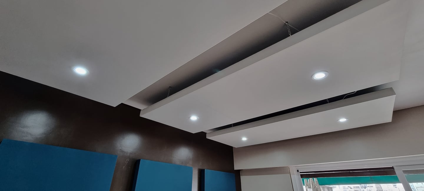La integración entre luz focal LED en el control acústico ofrece una pieza de doble utilidad. El foco embutido resalta detalles mientras la superficie absorbente mantiene el equilibrio sonoro con una estética contenida.