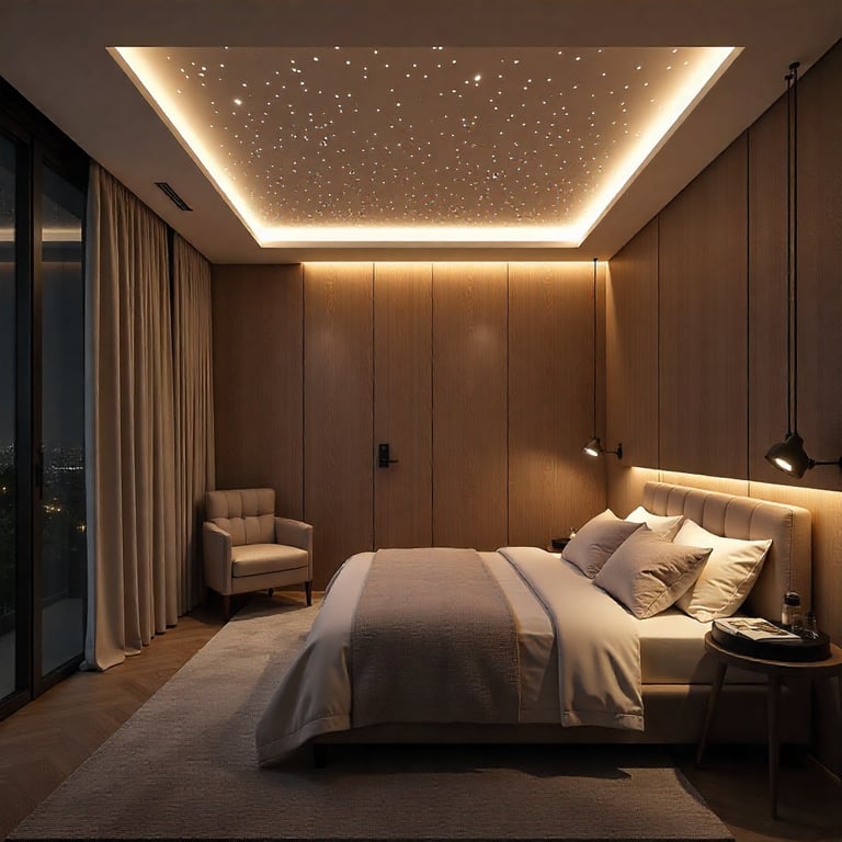 Revestimientos que integran absorción acústica e iluminación con fibra óptica. Un efecto de cielo estrellado único para espacios exclusivos.