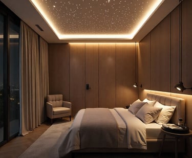 Revestimientos que integran absorción acústica e iluminación con fibra óptica. Un efecto de cielo estrellado único para espacios exclusivos.